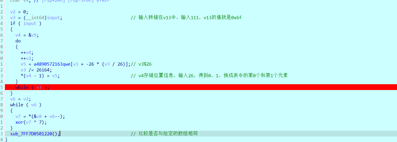简化下来就是我们输入1 2 3他给出表中下标1 2 3的元素,将其异或7,与给定字符串进行比较,不同的是我们不是直接输入位置信息,而是输入一个比较大的数,程序进行模运算和除法运算,从而转化出位置信息。